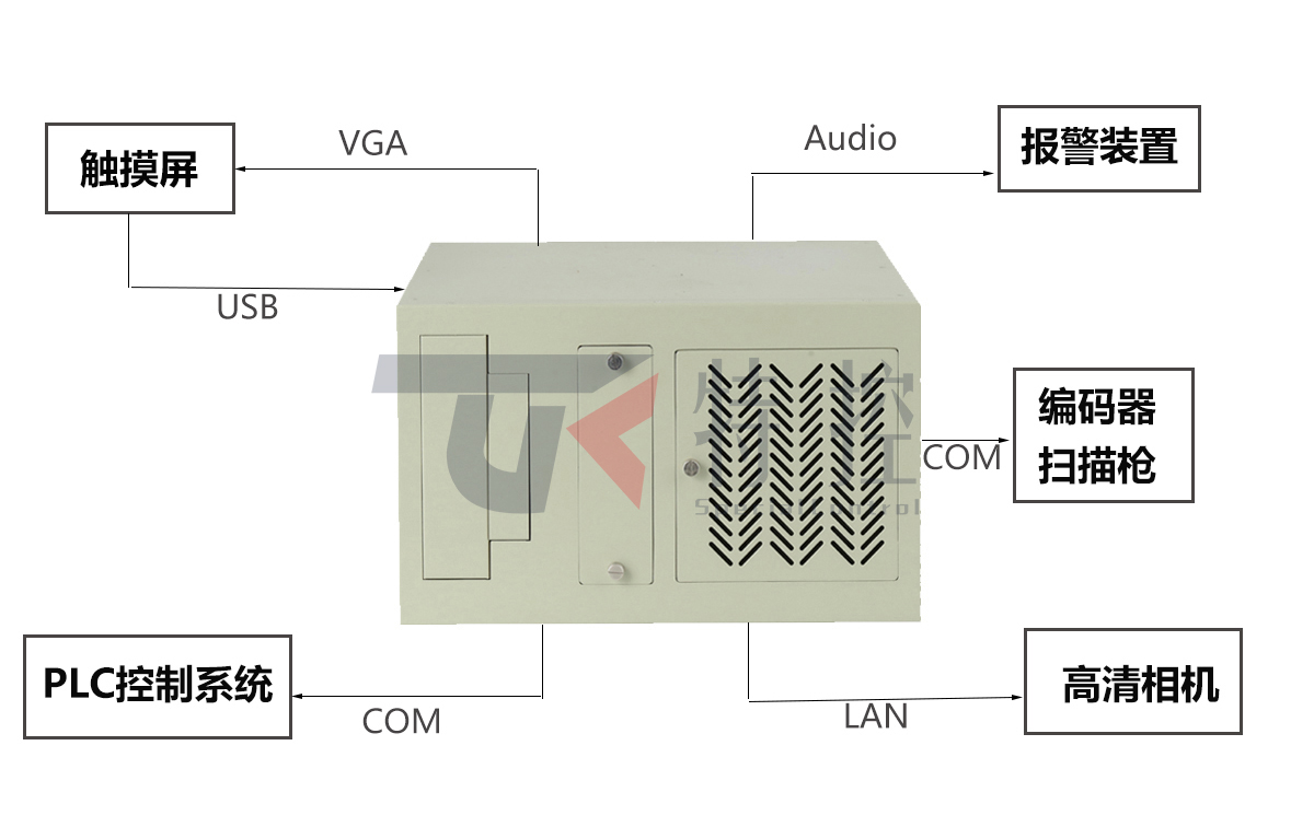 視覺系統(tǒng)包含鏡頭、CCD照相機(jī)、圖像處理單元(或圖像采集卡)、圖像處理軟件、監(jiān)視器、通訊/輸入輸出單元等。工控機(jī)連接USB、觸摸屏;PLC、編碼器、掃描槍等串口設(shè)備;并可搭載至少500W以上高清工業(yè)相機(jī)(數(shù)量可多個),同時內(nèi)嵌自行開發(fā)的圖像處理軟件,實現(xiàn)自動視覺檢測系統(tǒng)功能。工控機(jī)安放于檢測設(shè)備柜內(nèi), 通過主板自帶的兩個千兆網(wǎng)口,及PCIE槽/PCI槽在擴(kuò)出兩個網(wǎng)口,針對檢測系統(tǒng)要求高低的不同需要,通過CCD或視頻采集卡獲得客戶應(yīng)用所需要的圖像效果,并通過工控機(jī)進(jìn)行分析與處理。在此過程中可做到對目標(biāo)物進(jìn)行自動拍攝記錄存儲,傳輸?shù)龋纱蟠筇岣呱a(chǎn)自動化智能化進(jìn)程和效率。